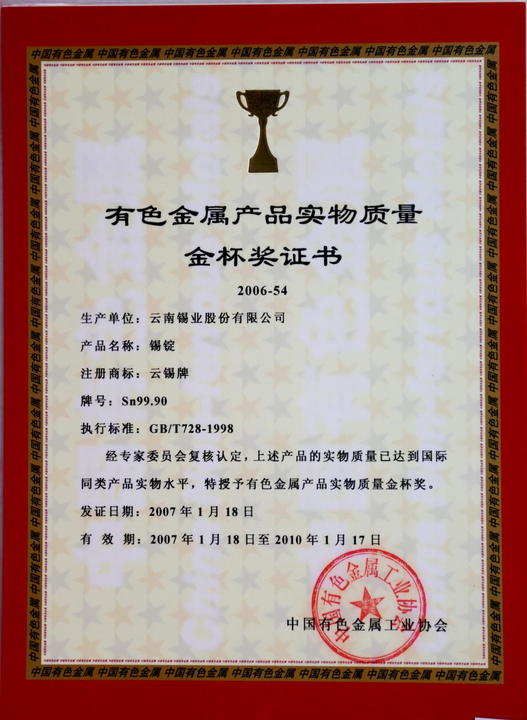 下一條:云錫牌錫基軸承合金獲有色金屬實物質量金杯獎