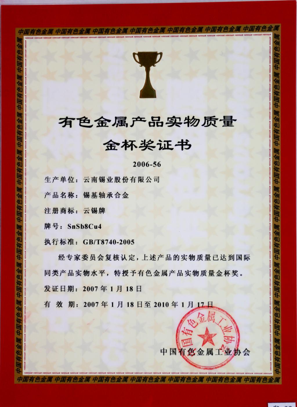 下一條:云錫牌鑄造錫鉛焊料獲有色金屬產品實物質量金杯獎證書